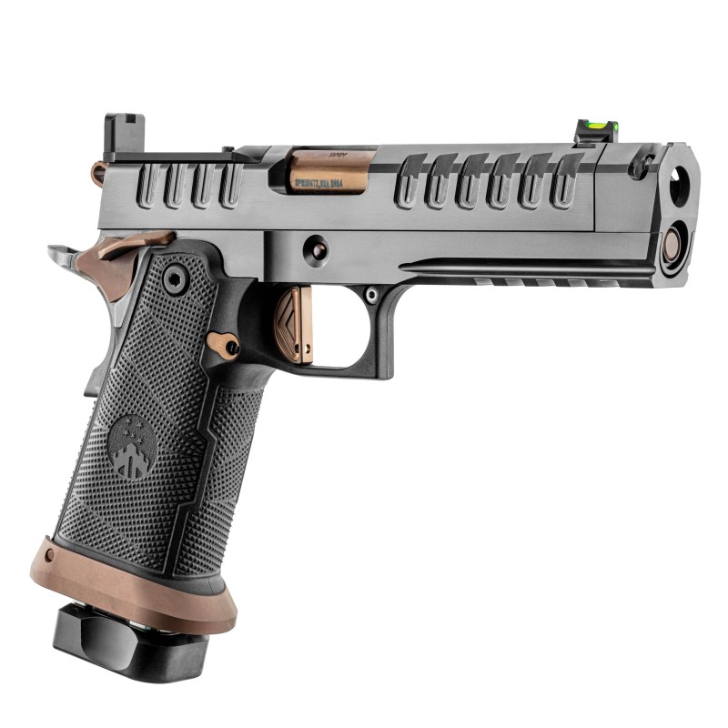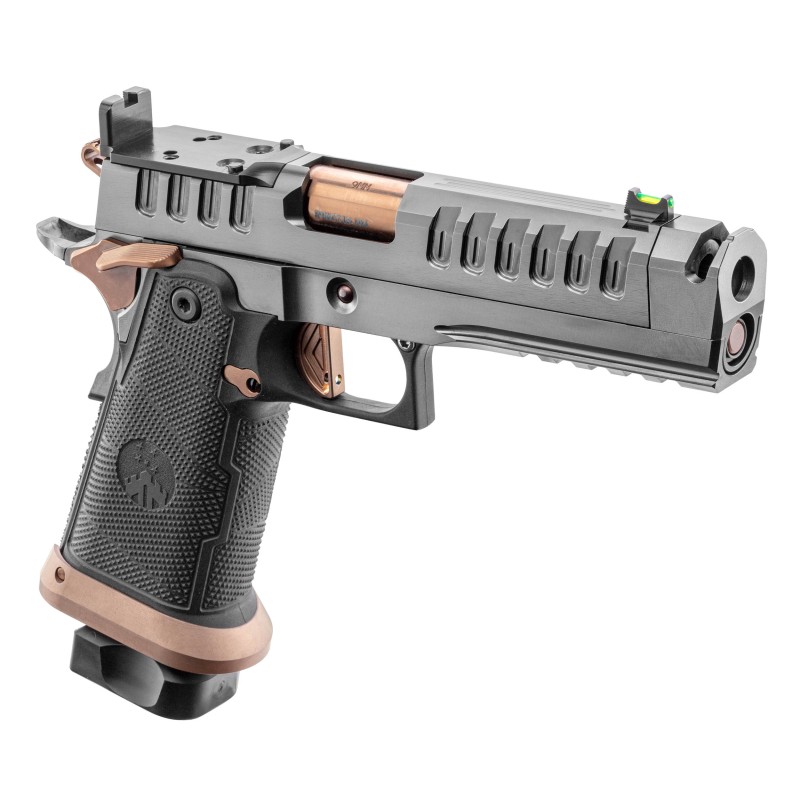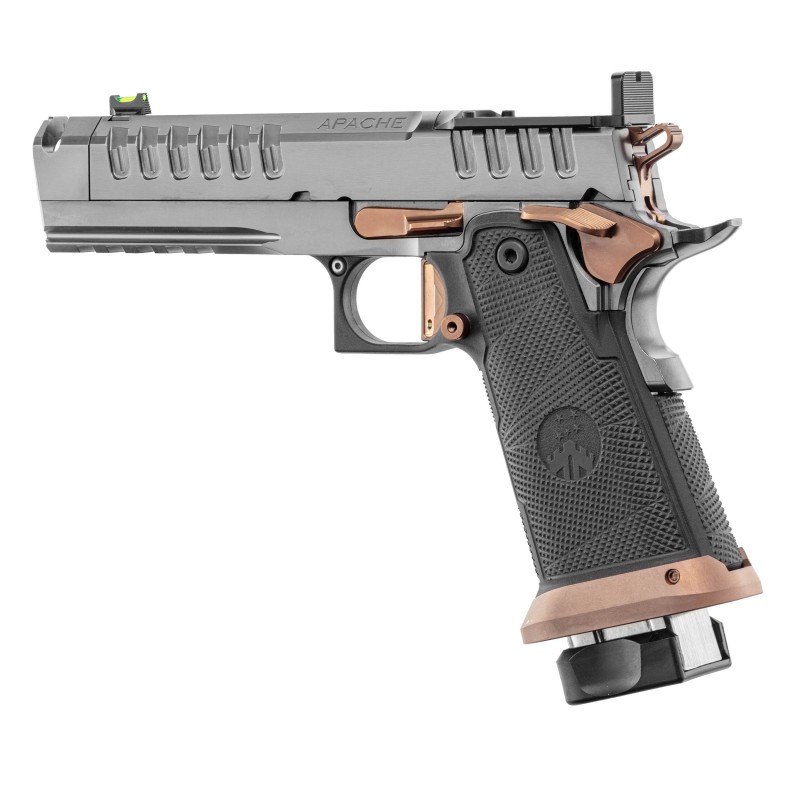 Le Watchtower APACHE 2011 en 9x19 mm est un pistolet haut de gamme conçu pour la performance et la précision. Équipé d’un canon en acier 416R avec compensateur, d’une détente droite et d’une sûreté ambidextre, il offre un excellent contrôle au tir. Sa plateforme optic ready, ses organes de visée à fibre optique et son traitement PVD assurent modernité et durabilité. Livré avec deux chargeurs de 17 et 20 coups ainsi qu’une housse de transport, il s’adresse aux tireurs exigeants recherchant fiabilité et efficacité.